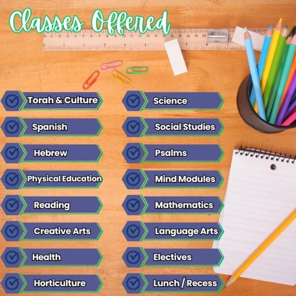 Upper Elementary, they explore a diverse range of subjects including Mathematics, Language Arts, Science, Social Studies, Reading, Hebrew, Torah & Culture, Psalms, Physical Education, Mind Modules, and Creative Arts, with additional opportunities in Health, Horticulture, and Electives.